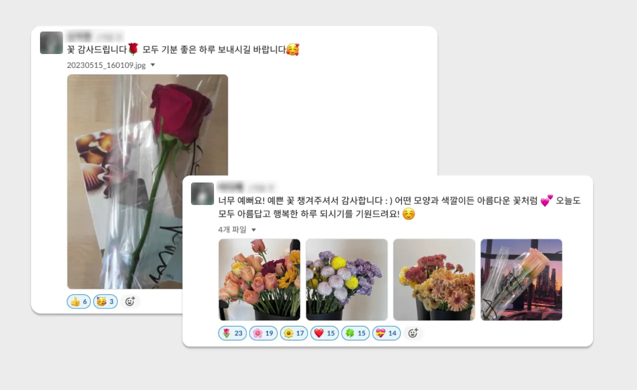 자칫 힘 빠질 수 있는 월요일 출근길에 행복을 선사해드릴 수 있어서 기뻤답니다. 한 팀원분은 사내 메신저에 어떤 모양과 색이든 아름다운 꽃처럼 아름답고 행복한 하루가 되기를 기원하는 댓글을 남겨주기도 했습니다.