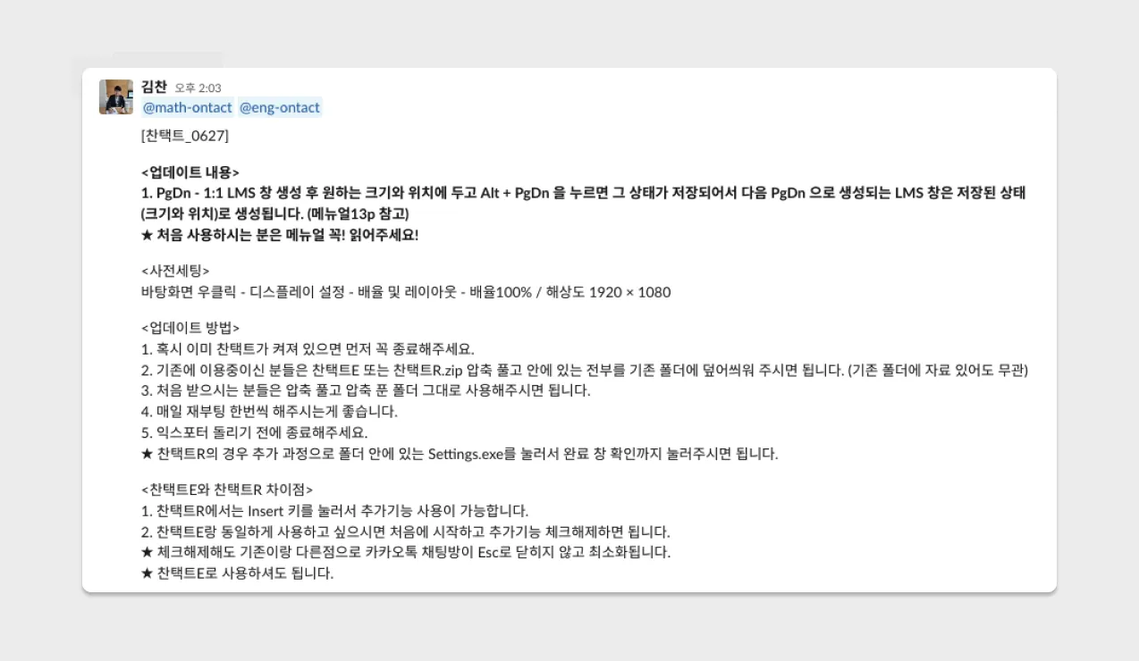 지난해 10월 입사해 지금까지 수학온택트선생님으로 일하고 있는 김찬 님도 비슷한 생각을 했던 것 같아요. 한 달 동안의 OJT를 마칠 때쯤 이런 생각이 들더래요. ‘반복적인 업무가 있으니, 간단한 매크로 프로그램*을 만들어 봐야겠다.’ 정보통신공학을 전공했던 찬님에게 매크로는 워낙 익숙한 개념이었어요. PC를 사용할 때 반복 동작이 있으면 혼자서도 매크로를 뚝딱뚝딱 만들어 쓰는 게 취미였다고요. 이렇게 보면 ‘찬택트’의 탄생은 당연한 수순이었군요!