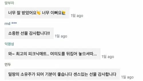 피크닉 매트와 함께 담겨 있던 메시지 카드에는 우리 뇌가 새로운 장소에 갈 때 더 활발히 움직인다는 내용이 써 있었는데요. 새로운 일터에서 새롭게 걸어 갈 아이헤이트플라잉버그스 팀원들이 피크닉 매트를 펼치는 모든 곳에서 좋은 추억을 쌓아 간다면 좋겠습니다.