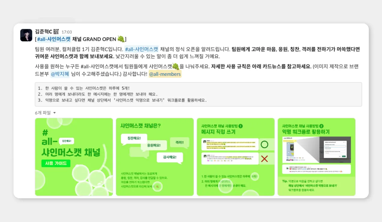 사용법은 이렇습니다. 실명이나 익명으로 샤인머스캣을 보낼 수 있는데요. 실명으로 보내고 싶다면 채널에 메시지를 작성하고, 샤인머스캣 이모지를 보내고 싶은만큼 함께 달아 두면 되고요. 익명으로 보내고 싶다면 슬랙의 기능을 활용해 보낼 사람과 갯수만 선택하면 돼요. 자연스럽게 교류도 늘리고, 서로 북돋울 수 있는 장치가 되겠죠? 컬처클럽 1기에서는 좋은 의견을 내준 준혁 님을 샤인머스캣 농장의 '농장주'로 임명했습니다.