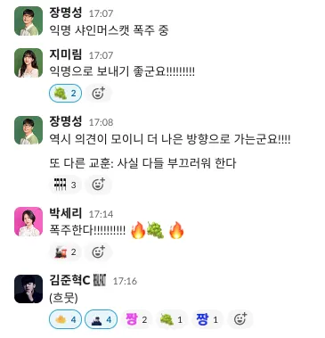 샤인머스캣 채널 아이디어를 낸 건 수학온택트본부의 김준혁 님이었습니다. 밀당에 오기 전 다니던 회사에서 감사와 격려, 칭찬의 의미로 토마토를 주고받던 광경이 인상 깊었다고 해요. 근태 시스템인 플렉스에도 인정하기 기능이 있긴 하지만 접근성이 조금 떨어지는 편이고, 슬랙 채널을 활용한다면 가볍게 고마움을 표현할 수 있을 테니까요.