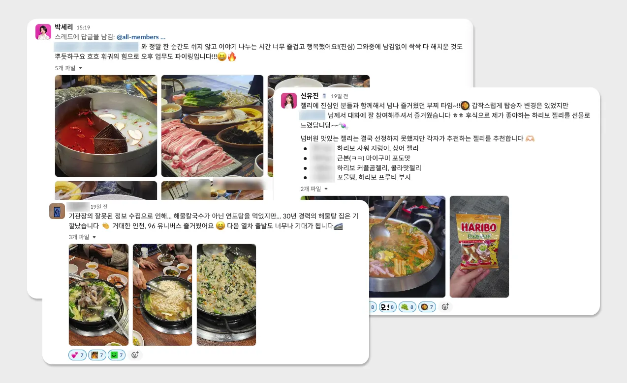 두 번의 운행 동안 여섯 팀이 모여서 여의도 맛집 뿌수기에 나섰습니다. 부대찌개나 돈까스 백반같은 직장인의 오랜 친구부터, 훠궈나 연포탕처럼 점심엔 좀처럼 먹기 힘든 메뉴들도 나왔어요. 웰컴키트나 영화 <오펜하이머>, 유학 이야기, 식단 등 다양한 주제로 이야기를 나누자고 다짐했지만, 주제보다는 맛있는 점심과 처음 만나는 팀원들과의 수다가 먼저였다는 웃픈 스토리도 전해집니다