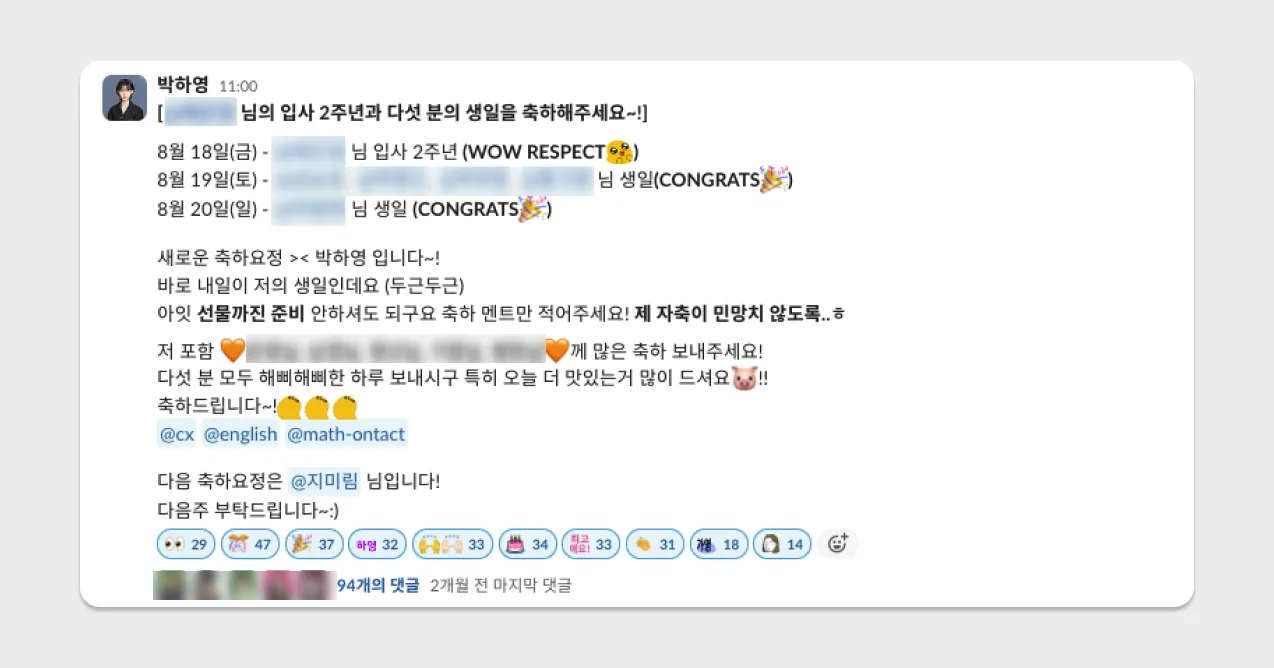 EX팀에서 매일 하는 업무 중 하나는 팀원들의 생일과 입사 기념일을 살피고, 전체 채널에 공지하는 일입니다. 이 ‘축하 공지’는 지난해 1월부터 하루도 빠지지 않고 이어져 온 유서 깊은 일(관련 글 링크)인데요. 아무래도 담당자가 매일 하다 보니, 팀원들도 익숙해져서 ‘그렇구나’ 하고 넘어가는 경우가 생기더라고요. 어떻게 하면 신선함을 줄 수 있을까? 그리고 조금 더 진심으로 서로에게 축하를 건네게 할 수 있을까? 고민하던 차에 컬처클럽에서 좋은 의견이 나왔어요.