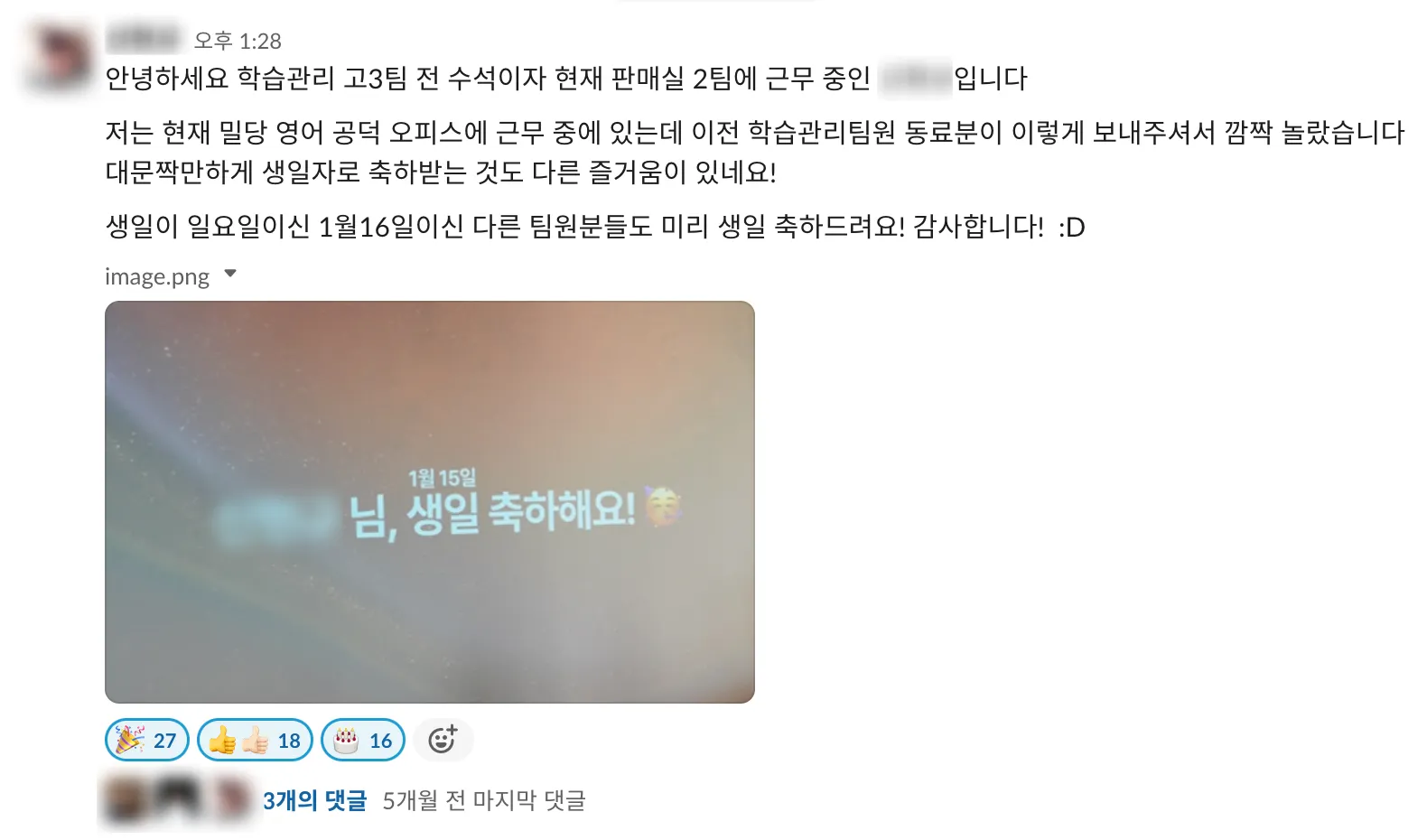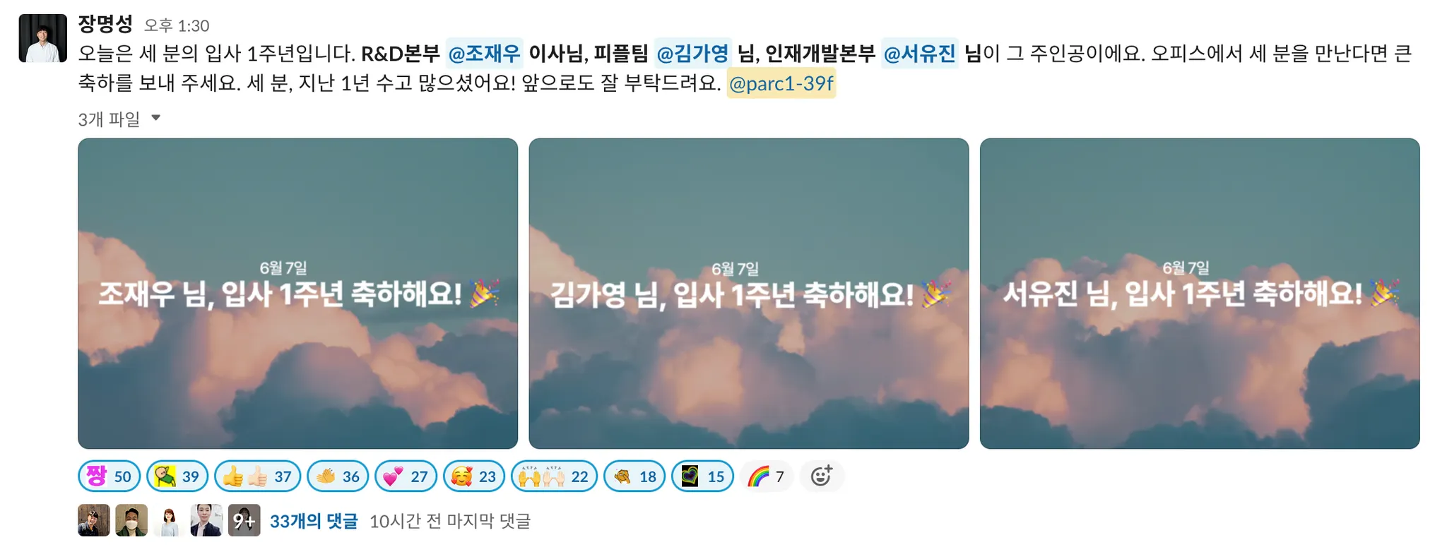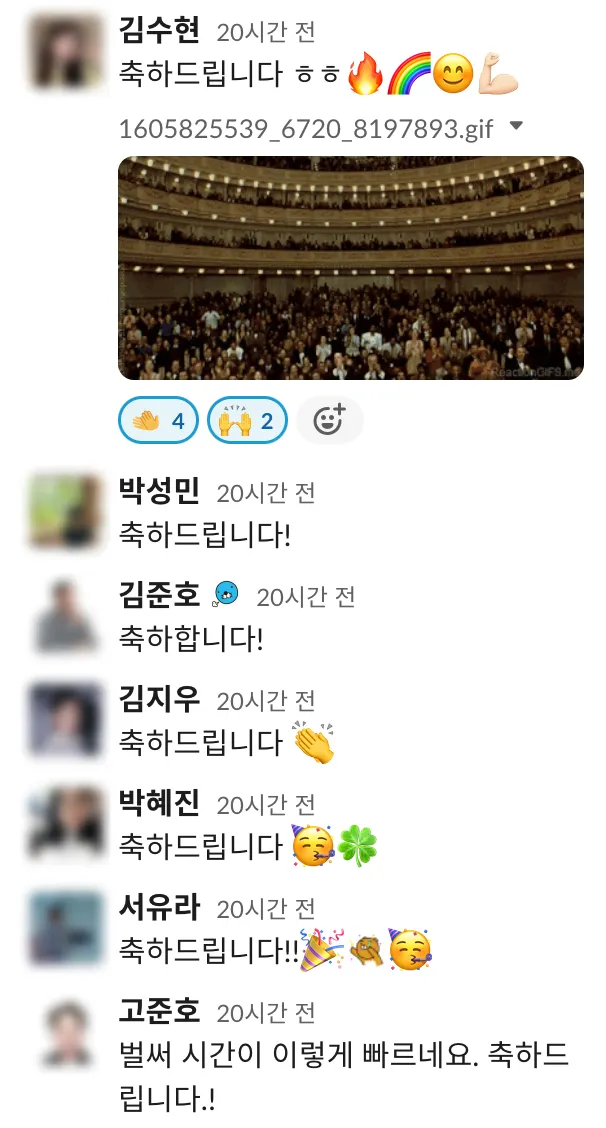"많이들 축하해 주세요!"라고 올리자 웬걸, 반응이 뜨겁습니다. 축하할 사람이 한 번에 두세 명씩 되다 보니 이모지와 댓글도 수십 개씩 달렸습니다. 피치 못할 사정이 있어 고안한 방식이긴 했지만, 팀원들에게는 더 가깝게 다가간 걸까요? 만나고는 쭈뼛거리다가 전하지 못할 축하가 메시지로 전달되는 모습도 보기 좋아 보였답니다. 세심히 의도한 건 아니지만 올해 조직문화 목표였던 ‘팀원들 사이의 접점 만들기’를 이뤄낸 순간이었어요.