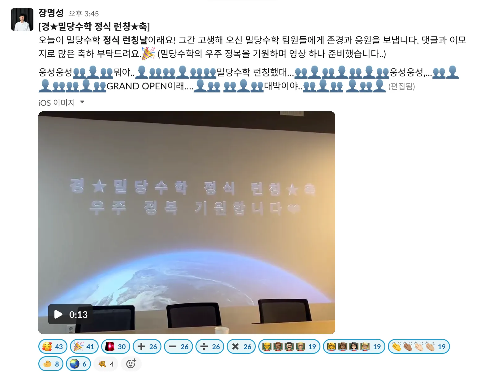 아이헤이트플라잉버그스 팀이 여의도 오피스로 이사 온 뒤, 축하 메시지를 띄워야 하는 라운지는 아직 인테리어 공사 중인데요. 띄울 화면이 없어서 축하를 멈춘다면, 공사 기간 중 기념일을 맞이할 팀원 수십 명이 실망할 수도 있잖아요? 아무말이나 올려도 아무도 뭐라 하지 않는 슬랙의 #all-random 채널에 축하를 올려보기로 했습니다.