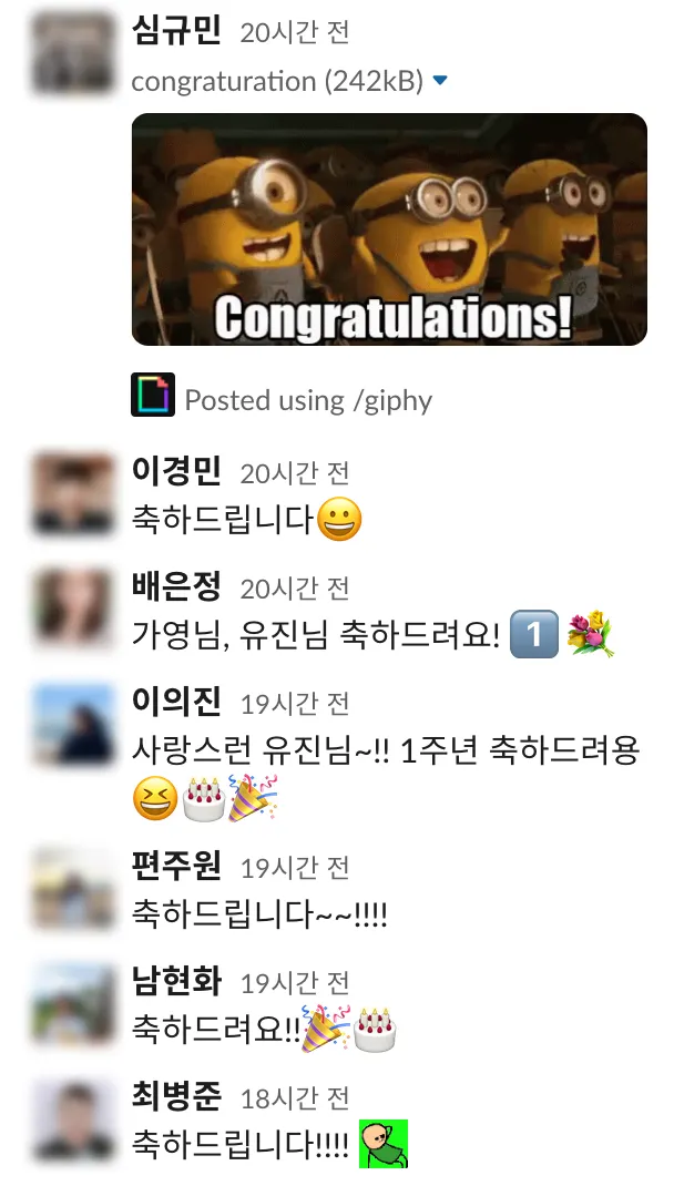 축하는 '내 일이 아니지만 내 일처럼 여겨 주는 따뜻함’이잖아요. 우리가 일하면서 가져야 할 마음도 이와 닮아 있지 않을까 생각해 봅니다. 내일은 또 어떤 축하할 일이 있을까요? 팀원은 많아지고, 축하할 일도 늘어만 가서 고되지만 기꺼운 맘으로 해보려고 합니다. 곧 다가올 저의 입사 1주년도 축하받아야 하니까요!