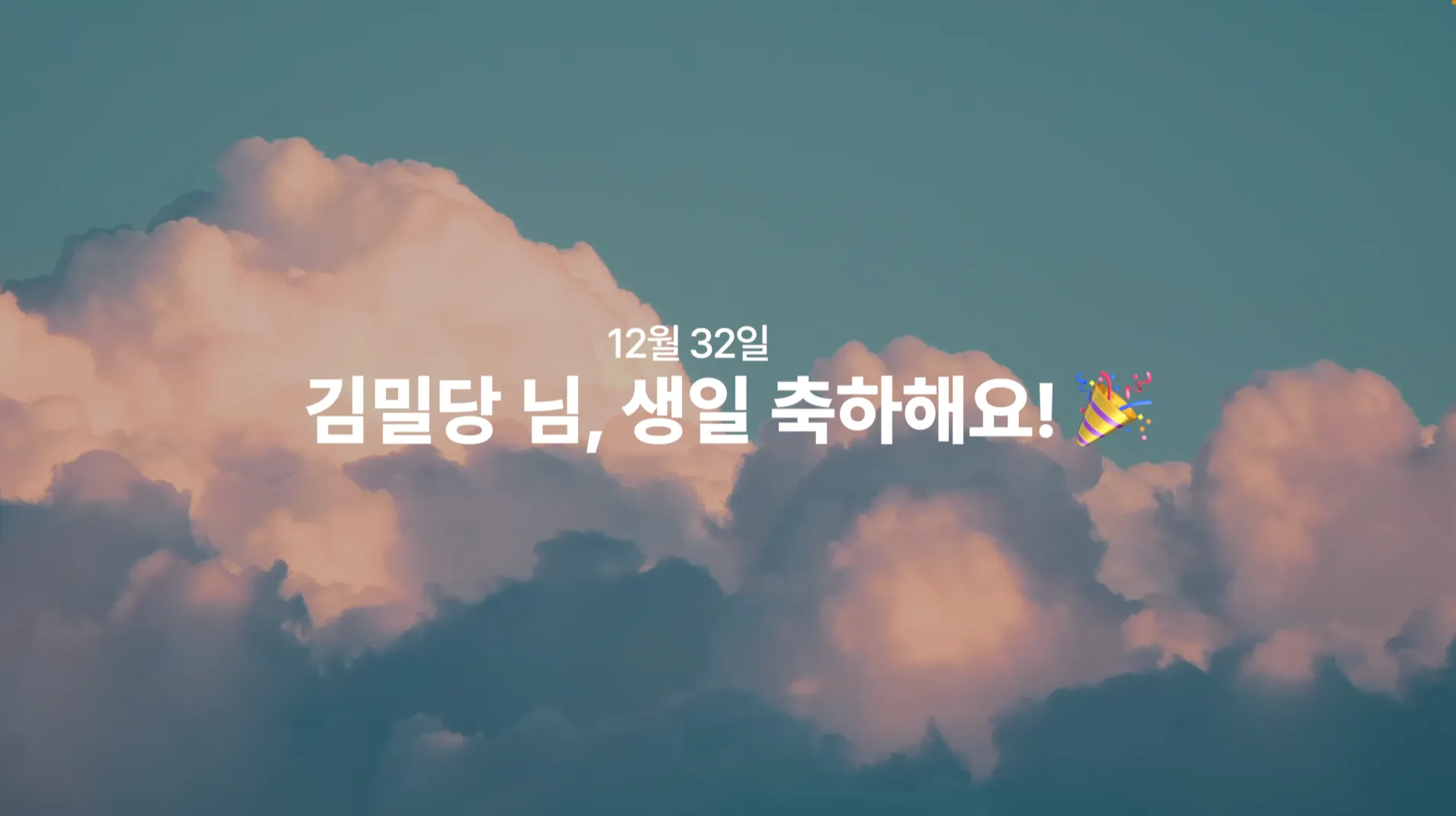 'XXX 님, 생일 축하해요!', 'OOO 님, 입사 2주년 축하해요!' 같은 문구들이 반복되도록 영상을 만들고 '무한 반복'을 시켜 놓으면 금세 완성! 팀원이 260명에 이르는 탓에 과장을 보태 365일 중 300일은 축하할 날인 것이 함정입니다만, 영상이야 틀을 짜 놓고 이름만 바꾸면 되도록 만들어 놓았으니 큰 어려움은 아닙니다.
