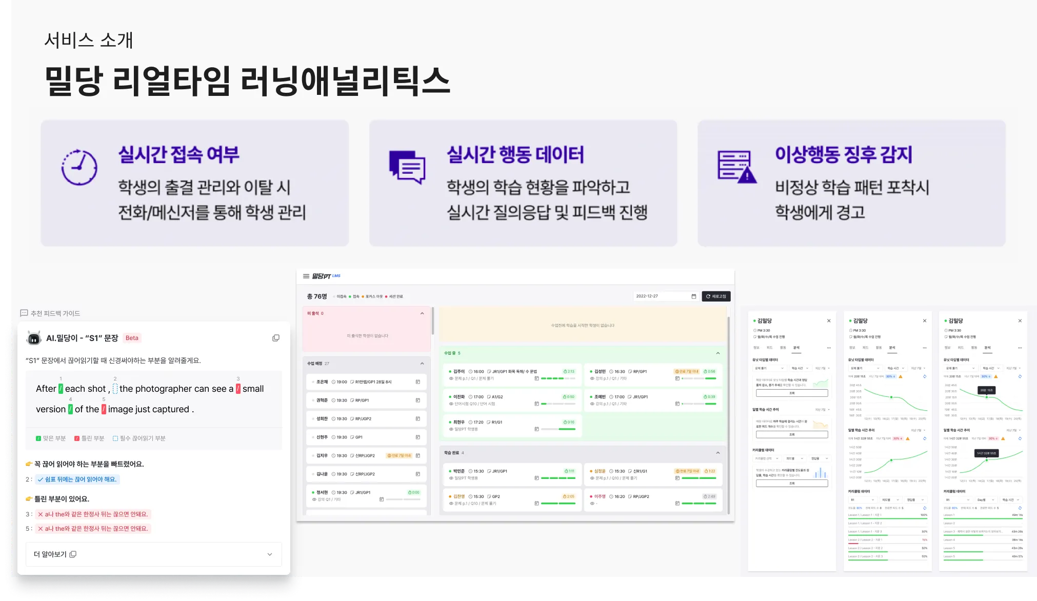 특히 요즘은 교육 분야에서도 AI가 다양하게 활용되고 있는데요. 박찬용 대표님이 2022 AI 전망 웨비나에서 밀당PT 기술에 대해 이야기하는 걸 듣고 확 느낄 수 있었어요. 학생이 알고 있는 것, 모르는 것을 파악해 공부할 수 있도록 도와주는 ‘어댑티브 러닝(Adaptive Learning)’과 실시간 학습 현황을 모니터링하는 ‘리얼타임 러닝 애널리틱스’가 서비스에 녹아있는 점이 매우 인상 깊더라고요.