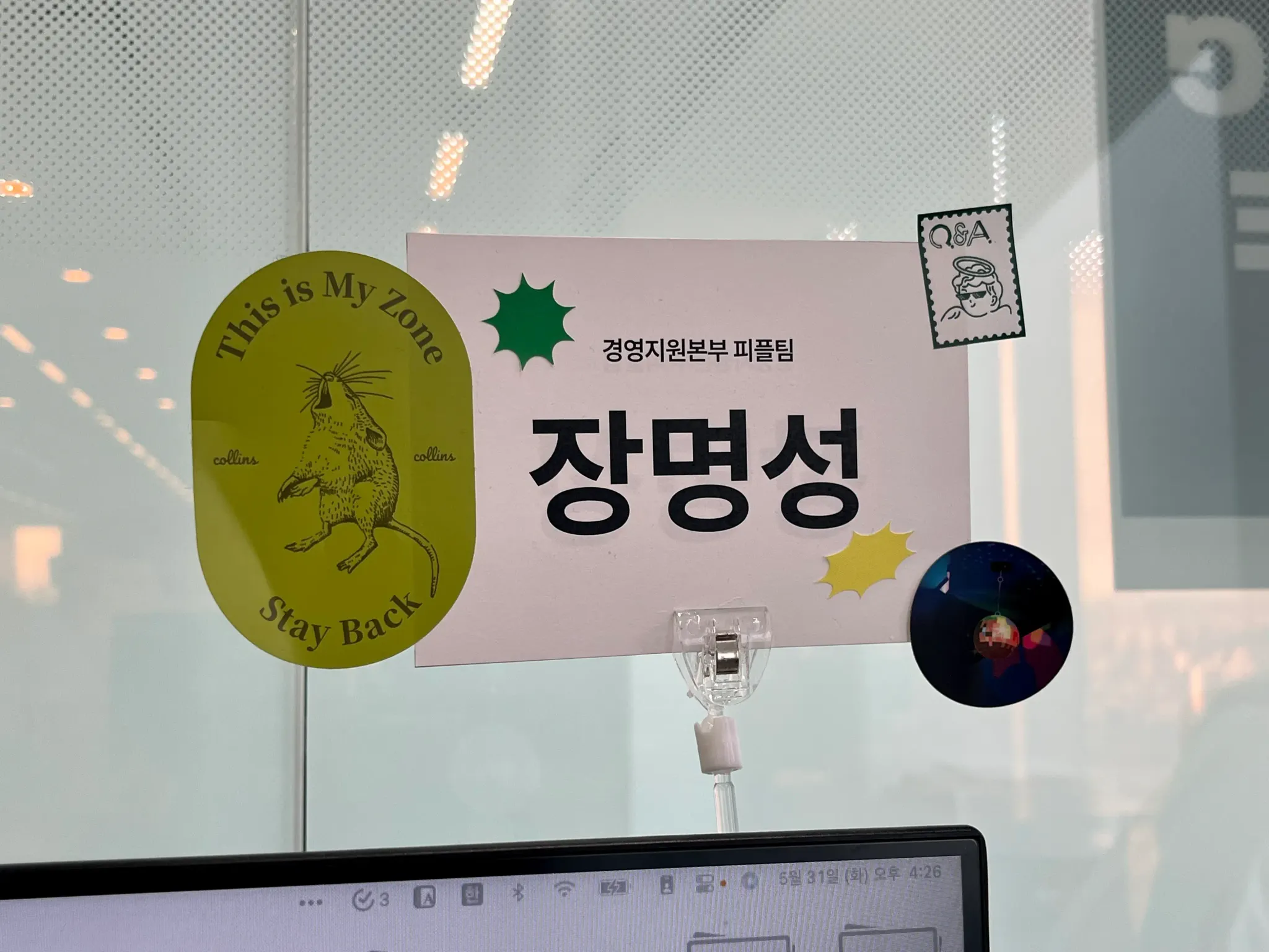 어떻게 만들었냐고요? 사진에서 보이듯 멀리서도 이름이 뚜렷이 보일 수 있게 이런저런 디자인적 요소는 배제했습니다. 가까이 다가가면 소속까지 파악할 수 있도록 작게 새겨 넣었습니다. ‘이름 석 자(혹은 두~네 자)가 잘 보이도록’이라는 최우선의 목표에 초점을 맞춘 겁니다. 별거 아니어 보일진 몰라도 심혈을 기울인 작품입니다.