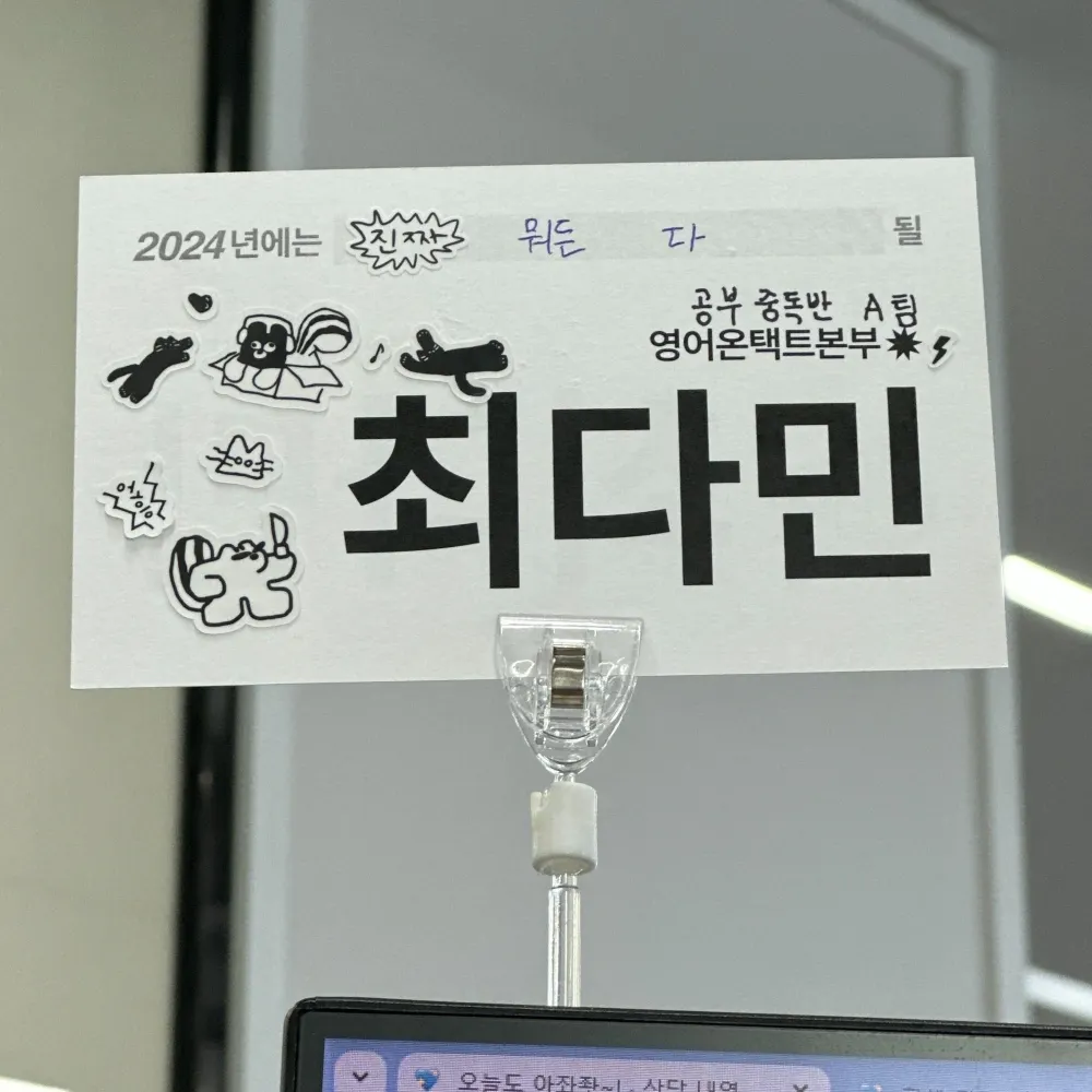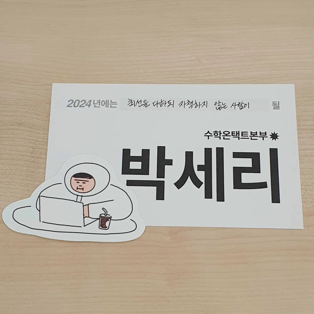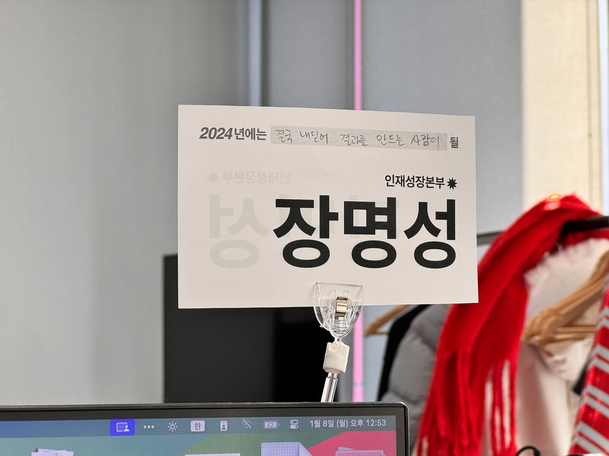 어떤 다짐을 썼는지 자랑하는 분들도 많았습니다. 저는 “결국 내디뎌 결과를 만드는 사람이 될”이라고 썼습니다. 2024년의 큰 목표를 쓰시는 분들도 있었고, 다이어트 목표를 쓰시는 분도 있었어요. ‘될놈될’이나 ‘짱이 될’과 같은 재치를 담은 팀원들도 있었습니다. 그 모든 목표들이 회사의 핵심 가치인 ‘발전’과 자연스레 연결되고 있는 것 같아 뿌듯했어요.