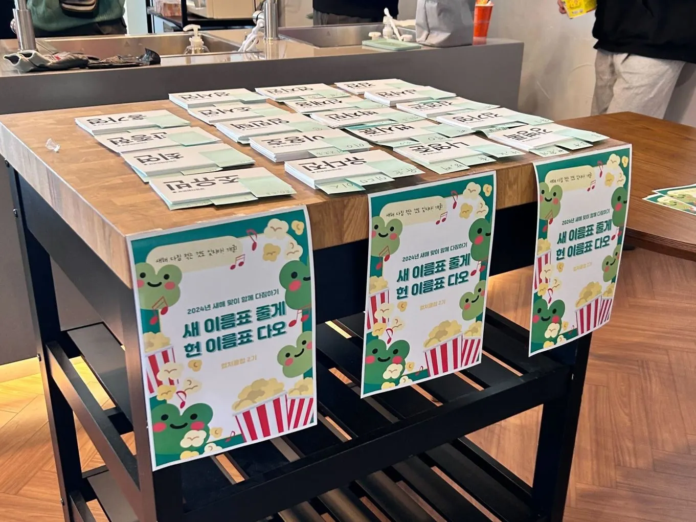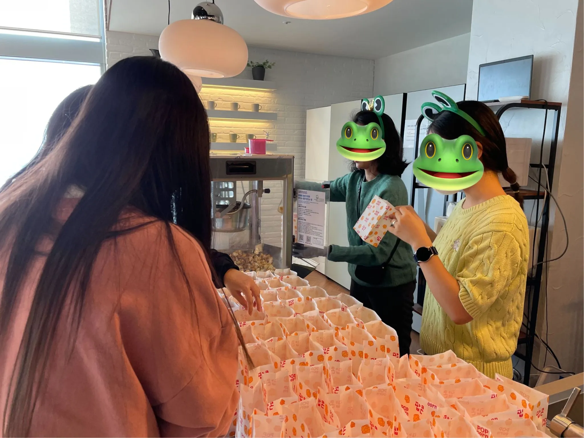 대망의 1월 5일, 파크원 38, 39층 라운지는 아마 반경 5km 내에서 가장 고소한 공간이었을 겁니다. 라운지를 가득 채운 팝콘 냄새는 구성원들 발길을 라운지로 절로 이끌었죠. 길게 늘어선 줄이 이름표(사실 팝콘?)의 인기를 실감케 했습니다. 한겨울이었음에도 팝콘 기계 앞에 선 컬처클럽 멤버들은 땀을 뻘뻘 흘렸는데요. 기기가 계속 열을 내뿜다 보니 정말 뜨겁더라고요. 멤버들이 고생 많이 했습니다.