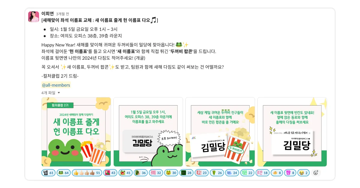 이름표 행사 공지글입니다. 희연님이 직접 써 주셨고, 귀여운 카드뉴스도 함께 올렸어요.