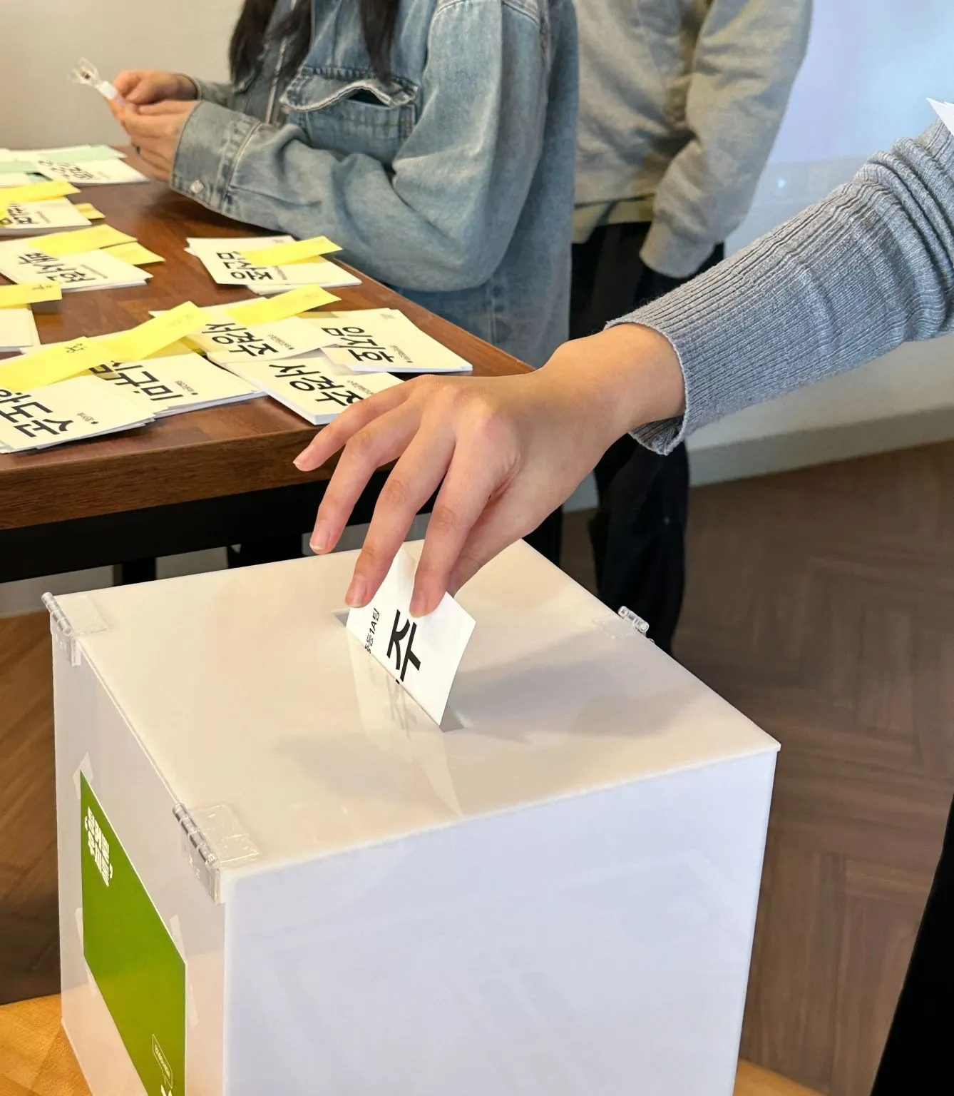 사진과 같이 예전 이름표를 수거함에 넣으면, 새 이름표를 찾아서 건네줬어요. 사람이 많아 구분하기 쉽지 않았지만 여러 번 반복하다 보니 요령이 생기더라고요. 소속이 다른 팀원들을 만날 일이 적은 컬처클럽 멤버들에게는 처음 보는 팀원들 이름을 부르며 간단히 인사를 나누는 것도 좋은 경험이 되었을 겁니다.