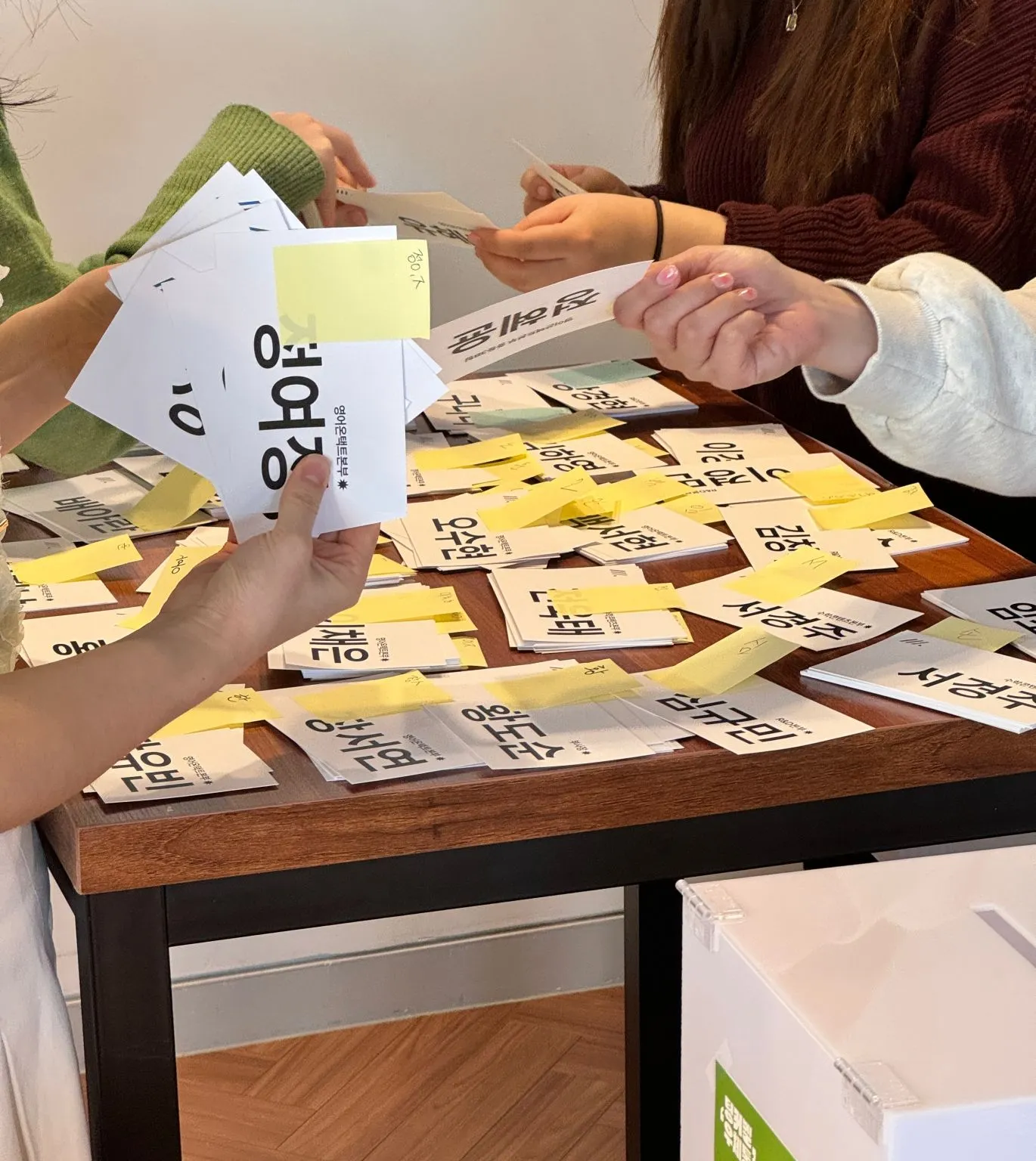 어쩌다보니 꽤 커져버린 행사였지만, 핵심가치를 인지시키고 직접 생각해 보게 하는 데 큰 효과가 있었습니다. 이후 입사한 팀원들에게는 출근과 동시에 이름표를 나눠주고, OJT 중 진행되는 핵심가치 교육 시간에 이름표를 채워 보도록 하고 있습니다. 팀원 한 분의 작은 아이디어가 모든 팀원에게 영향을 미칠 수 있다니, 조직문화가 이렇게나 유기적인 것이라는 걸 다시 한번 깨달았어요. 한 팀이나 담당자가 다 ‘담당’할 수 없다는 것도요.