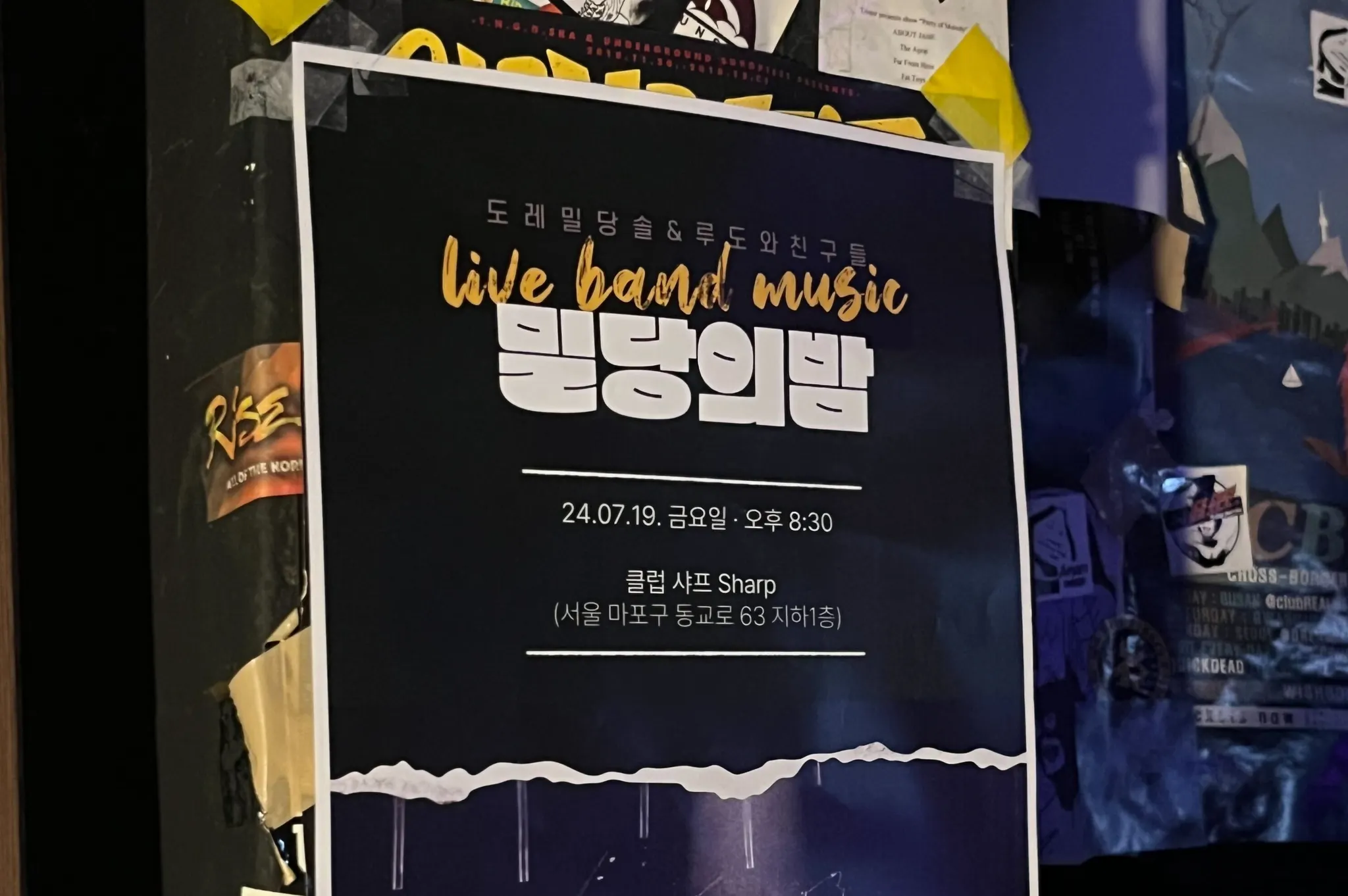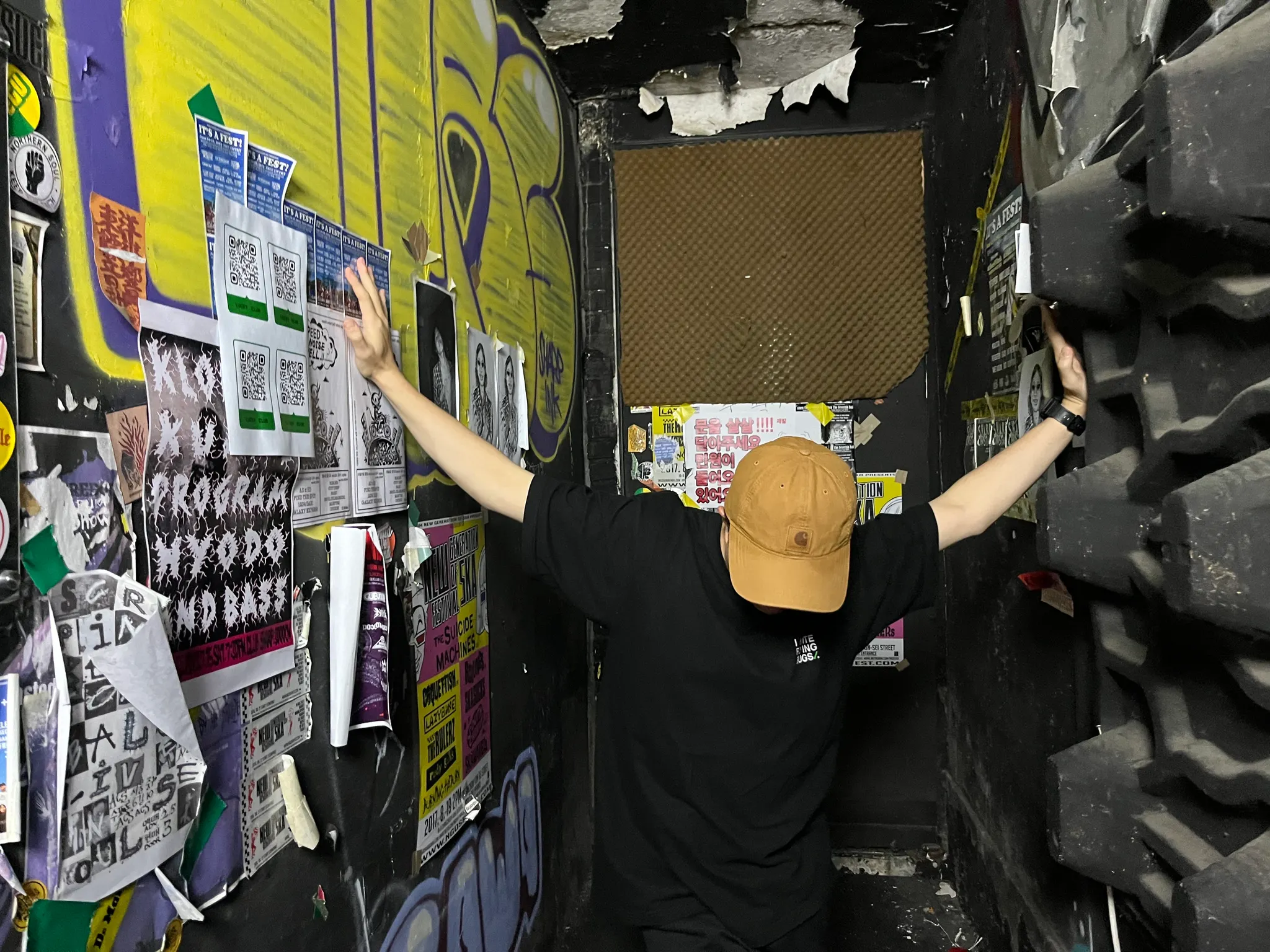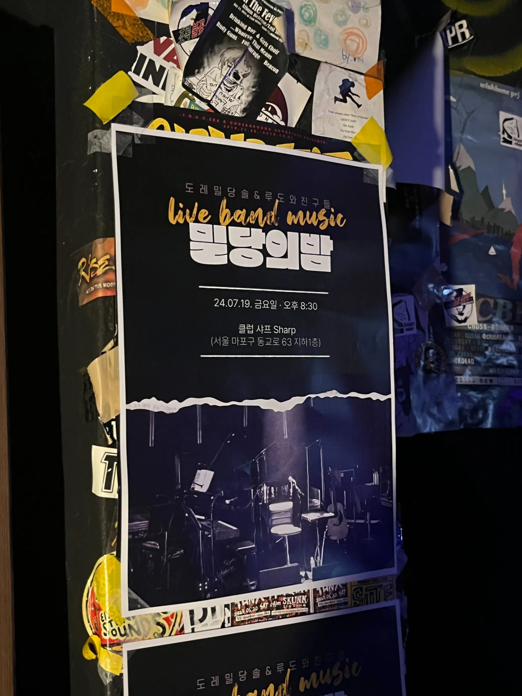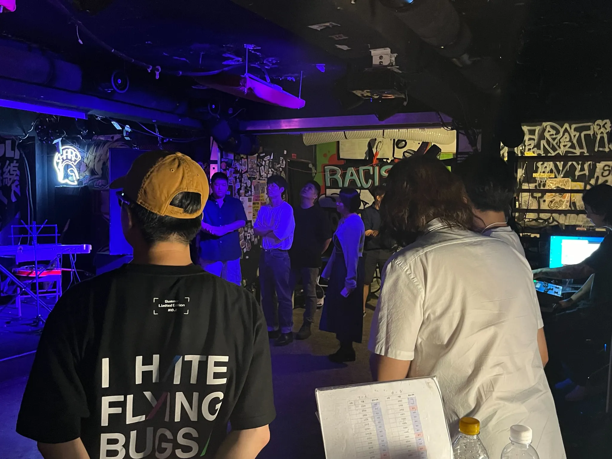 들어가 보니 제가 상상하던 공연장, 그 자체였습니다. 포스터와 밴드 로고 스티커가 잔뜩 붙어있고, 여기저기 앰프 선이 늘어져 있고, 무대 한쪽에선 기타 튜닝 소리가 들리는 그런 모습이요. 공연장에는 미리 도착한 멤버들이 리허설을 하고 있었습니다. 살짝 긴장한 멤버들을 보니 저까지 떨리더라고요.