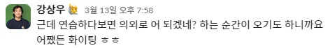 제게 인상 깊은 메시지가 있었는데요. 어려운 곡을 만난 탓에 다음 합주까지 곡을 완성시키지 못할 것 같다고, 최대한 노력해 보겠다고 양해를 구하는 멤버가 있었습니다. 이 멤버에게 호스트 상우님은 ‘연습하다 보면 의외로 어 되겠네? 하는 순간이 오기도 하니까요. 어쨌든 화이팅ㅎㅎ’이라는 담백한 응원 댓글을 달았습니다. 연습하고 있는 곡이 지금은 어려울지라도, 꾸준히 하다 보면 어 되겠네? 라는 말처럼 가능성을 보게 되잖아요. 여기서 정진하면 끝내 성공하게 되고요.
