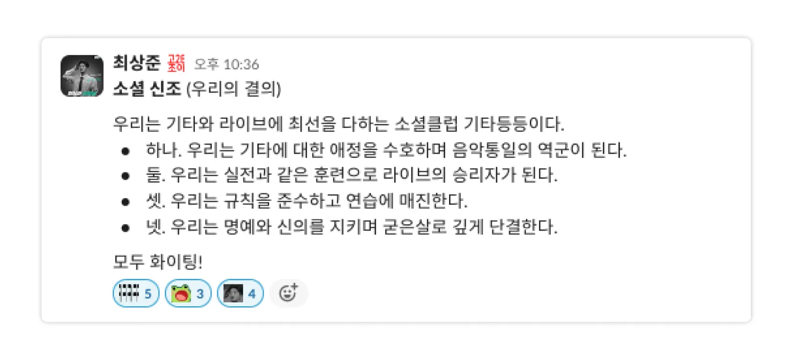 앞선 세 기수 동안 음악 클럽이 없었거든요. 그래서 기타등등을 더 눈여겨봤어요. 클럽을 열게 된 특별한 계기가 있었나요?