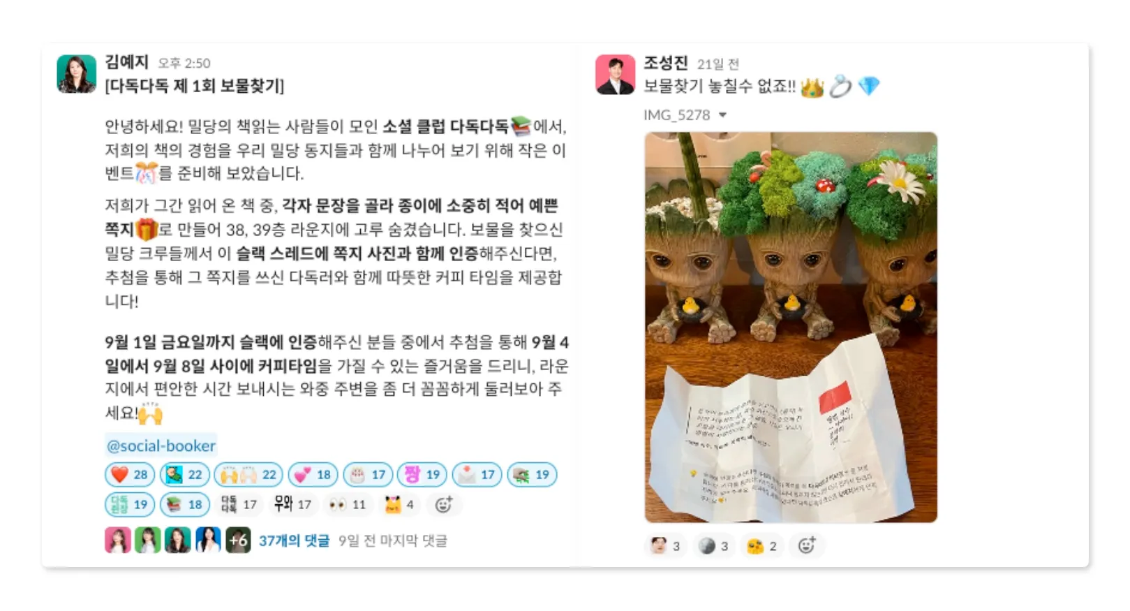 다독다독 2기, 기타등등의 사이버 라이브… 기대되는 것 투성이네요! 보물찾기 같은 활동을 통해서 소셜클럽을 하지 않는 팀원들에게도 즐거움이 전해졌겠죠? 사실 이번에 다루지 못한 소셜클럽들도 많은데요. 두 번째 사진전을 열었던 사진 클럽 김치치즈스마일, 아이헤이트플라잉버그스에 웨이트 트레이닝 붐을 불러일으킨 언제철들래, 1기서부터 6개의 산을 정복한 내이름은산타 등 다양한 클럽 이야기를 차차 다뤄보도록 할게요.