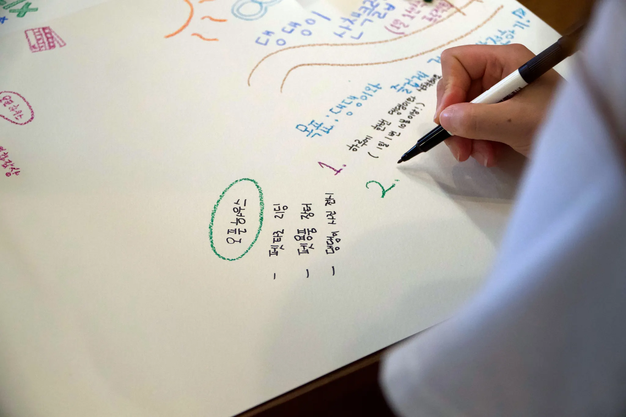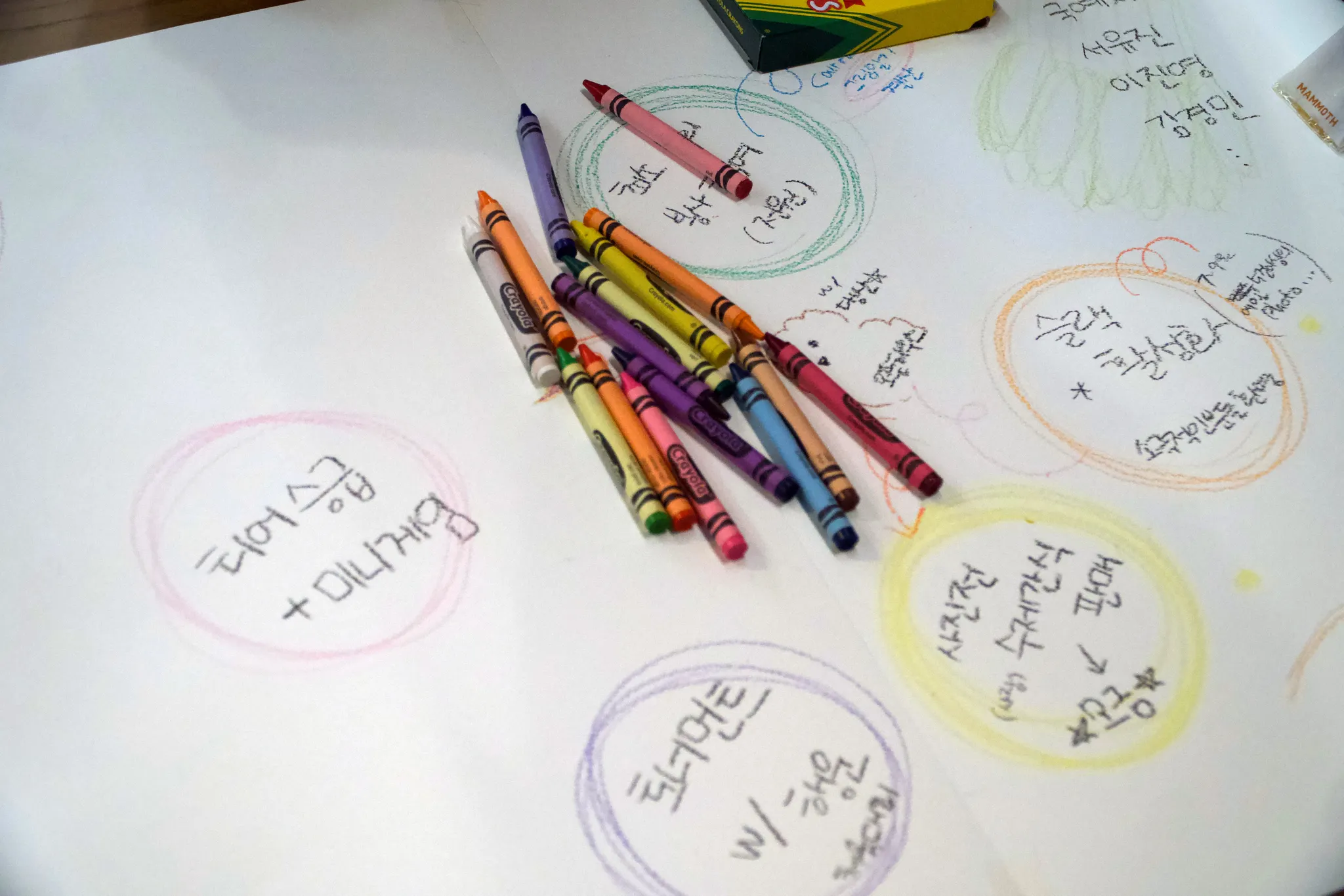 동료를 그려주며 한바탕 웃고 난 다음엔 본격적으로 목표와 계획을 짜기 시작했습니다. 큰 전지에 알록달록한 크레파스로 머릿속으로 생각만 하던 소셜클럽의 목표와 운영 계획을 그려 나갔죠.