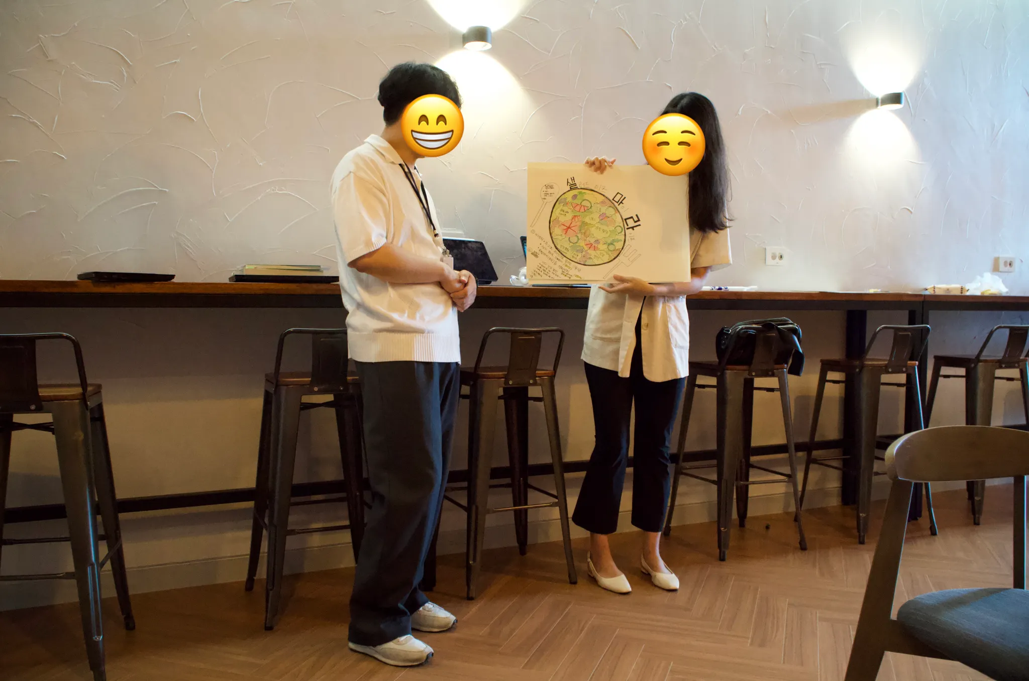 아닙니다. 바로 옆 자리 동료의 얼굴을 그리는 일이었죠. 그리고 옆 자리 동료가 그려 준 그림과 함께 다른 사람들에게 짧은 자기소개를 했습니다. 도대체 워크숍에서 왜 이런 걸 하냐고요? 소셜클럽의 목적이 ‘좋은 경험 만들어 주기’인 만큼 호스트부터 워크숍으로 좋은 경험을 만들 수 있길 바랐거든요. 딱딱하고 낯선 분위기보다 재미있고 말랑말랑한 분위기에서 더 좋은 아이디어들을 떠올릴 거라 기대하기도 했고요.