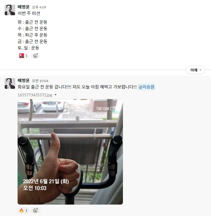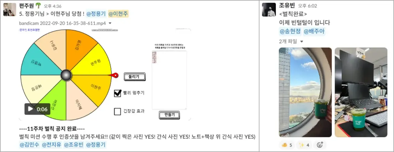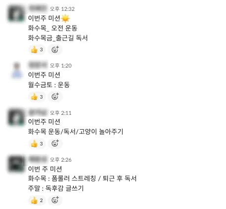매주 월요일이면 젖먹던힘 채널은 ‘한 주 동안 지킬 나와의 약속’으로 가득찼습니다. 운동과 식단을 다짐하는 팀원들도 많았고요, 어떤 팀원은 업무에 필요한 공부나 독서를 하겠다고 선포했어요. ‘고양이 놀아주기’나 ‘영양제 챙겨 먹기’와 같이 사소해 보이는 다짐도 젖먹던힘에선 얼마든지 환영입니다. 대신 지키지 못할 약속은 하지 않기! 나와의 약속을 지키지 못할 시 무시무시한 벌금(1,000원)이 기다리고 있으니까요.