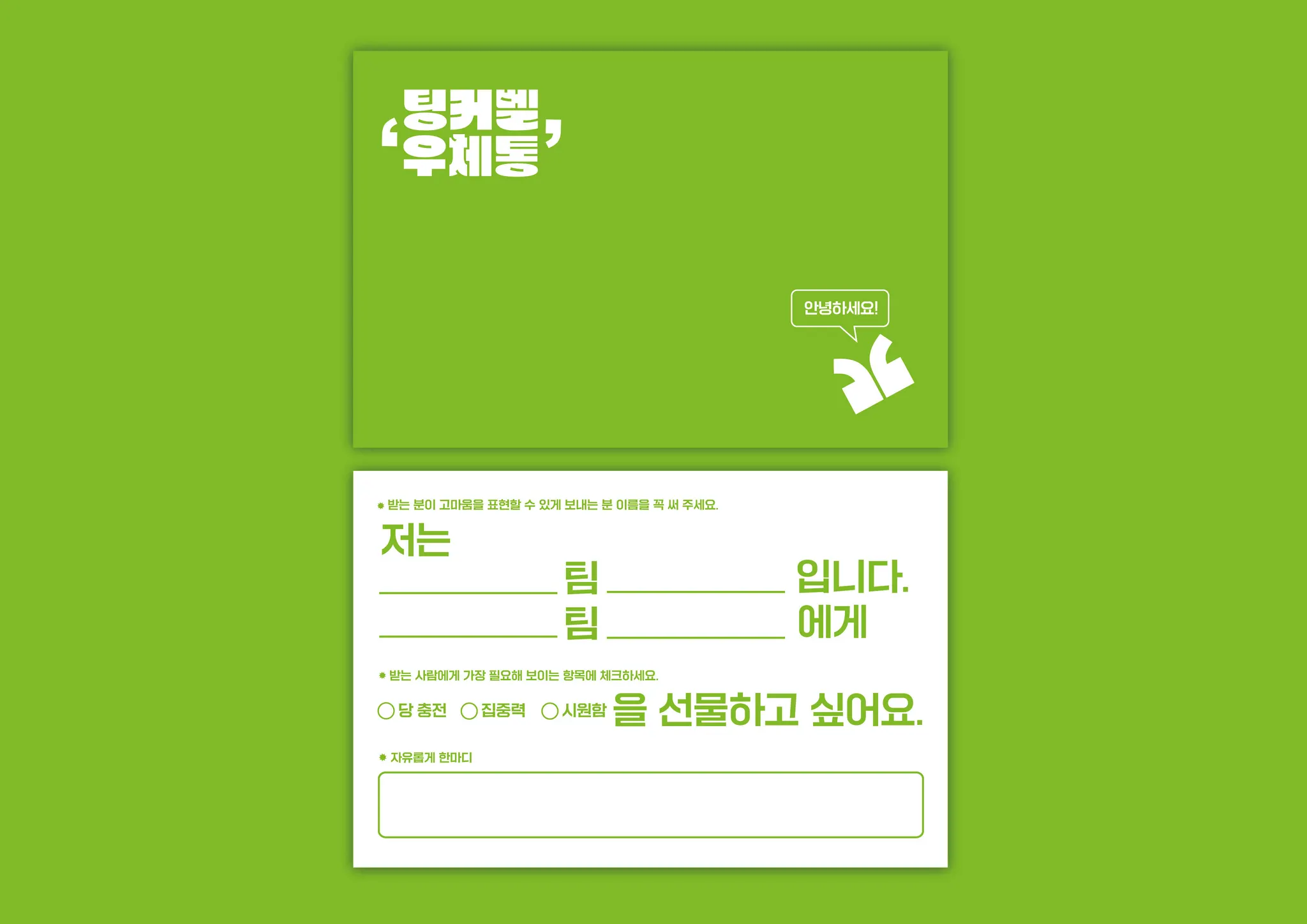고마운 동료 혹은 친해지고 싶은 동료가 있지만 매일 본다는 이유로, 바쁘다는 이유로, 부끄럽다는 이유로 마음을 전하지 못한 적 있지 않나요? 단 한 마디로 동료와 인연을 시작할 수도, 더 깊은 인연을 이어갈 수도 있다는 걸 우리 모두 알고 있지만 그 한 마디를 건네는 게 참 쉽지 않은 것 같아요.